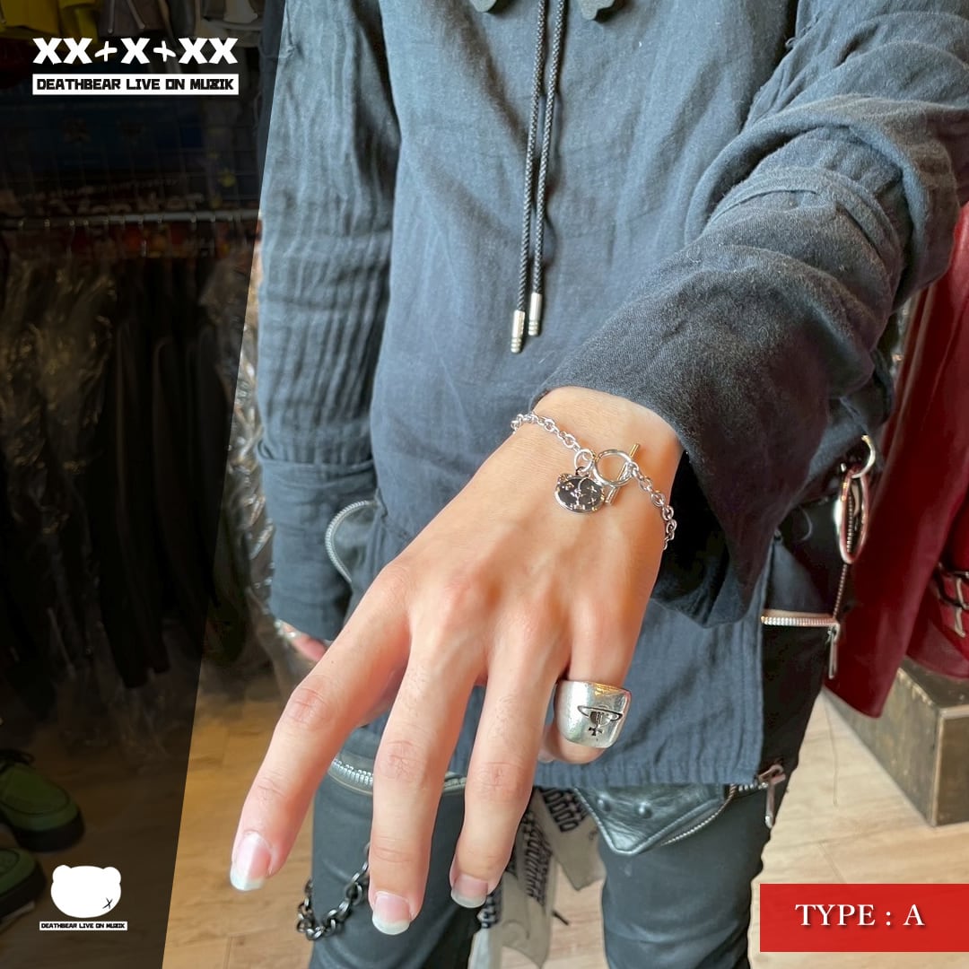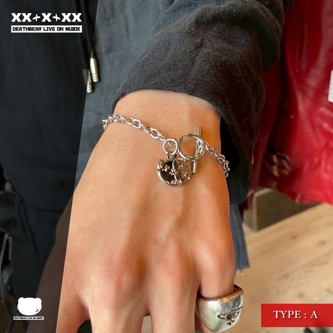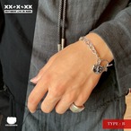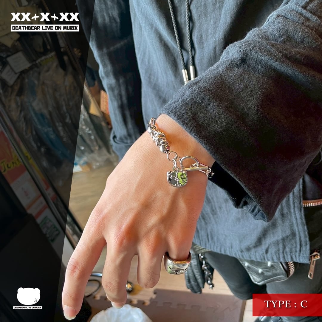 ランダムに組まれたゴツめのチェーンに、デスベアのチャームをあしらった個性的なブレスレットです。