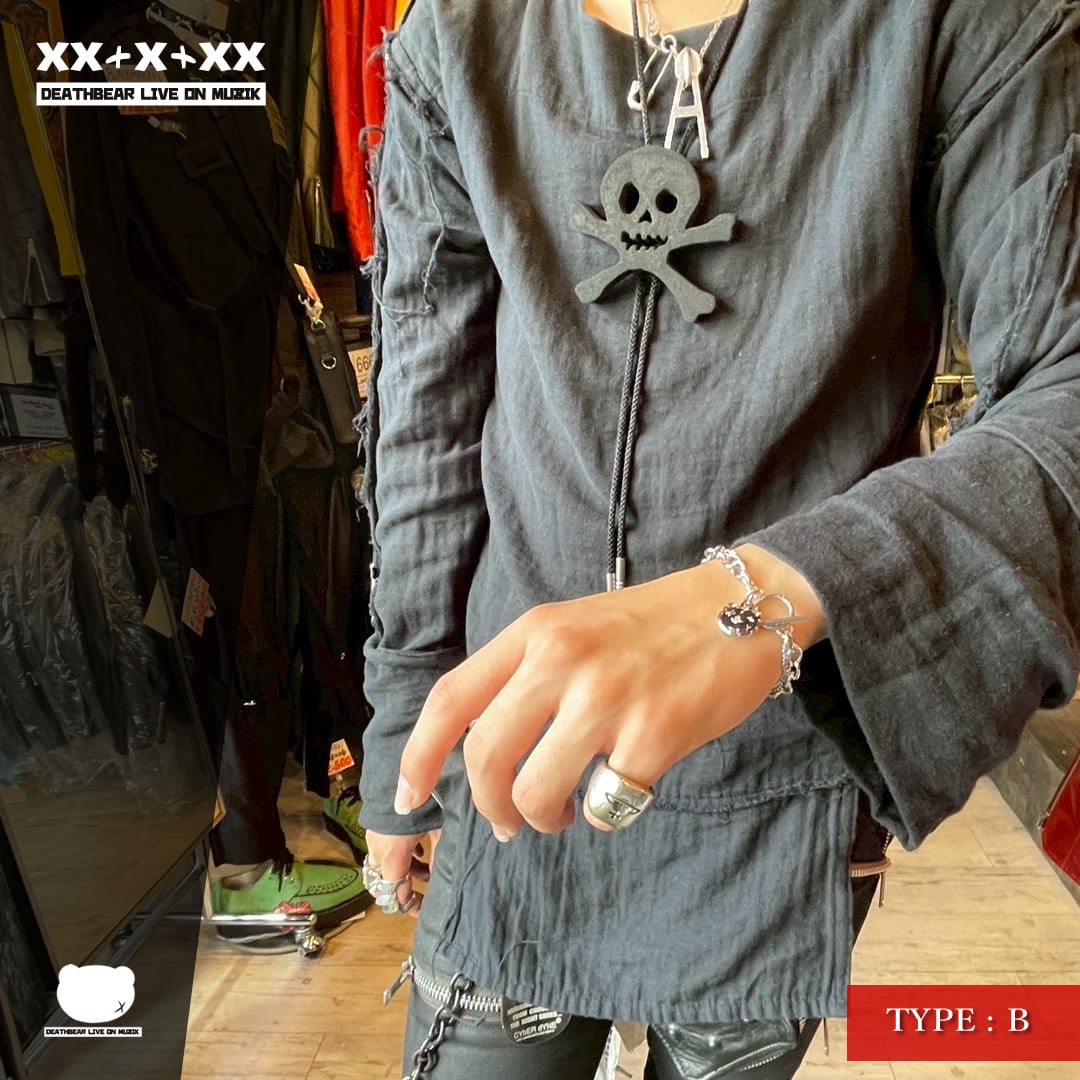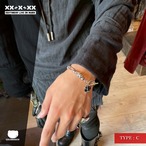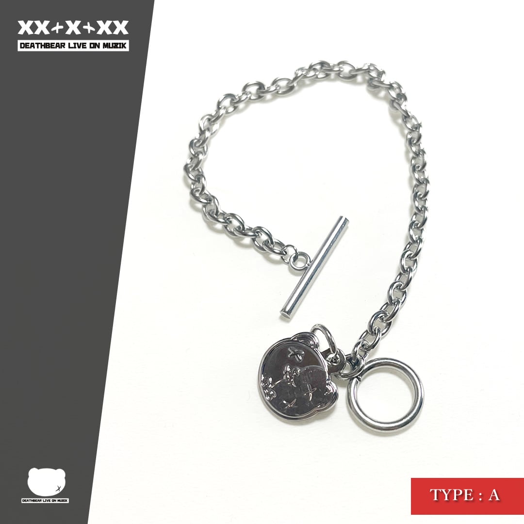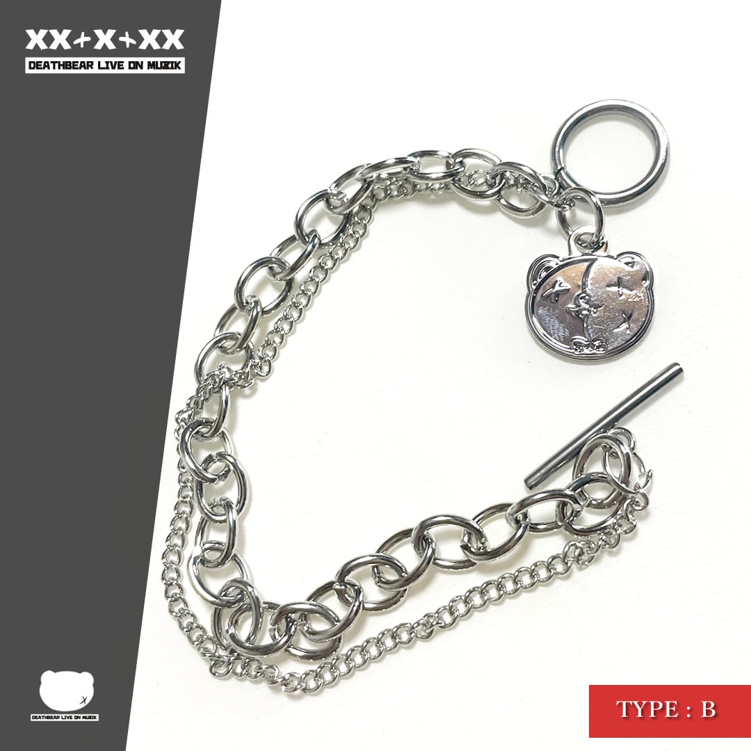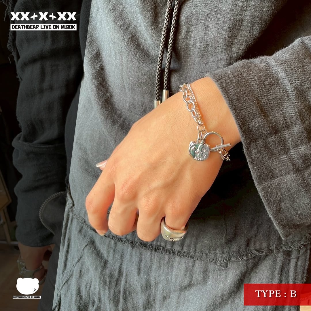 ランダムに組まれたゴツめのチェーンに、デスベアのチャームをあしらった個性的なブレスレットです。